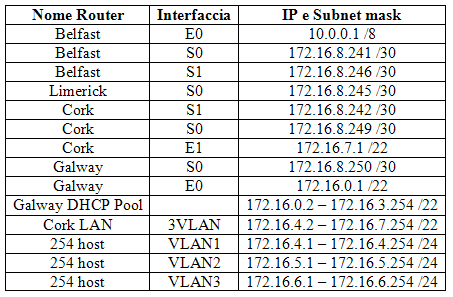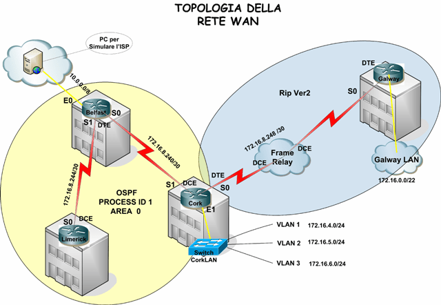 access-list 1 permit 172.16.0.0 0.0.255.255 access-list 1 deny any ip nat pool public 192.168.1.6 192.168.1.6 netmask 255.255.255.252 ip nat source list 1 pool public overload ip nat translation timeout 120 int s0 ip address 172.16.8.241 255.255.255.252 description Interfaccia Serial0/0 – DCE verso Cork Serial0/1 clock rate 2000000 ip ospf message-digest-key 1 md5 7 ospfauth ip nat inside no shutdown exit int s1 ip address 172.16.8.246 255.255.255.252 description Interfaccia Serial0/1 – DTE verso Limerick Serial0/0 ip ospf message-digest-key 1 md5 7 ospfauth ip nat inside no shutdown exit int e0 ip address 10.0.0.1 255.0.0.0 description Interfaccia Ethernet0/0 – Connessione verso ISP ip nat outside no shutdown exit