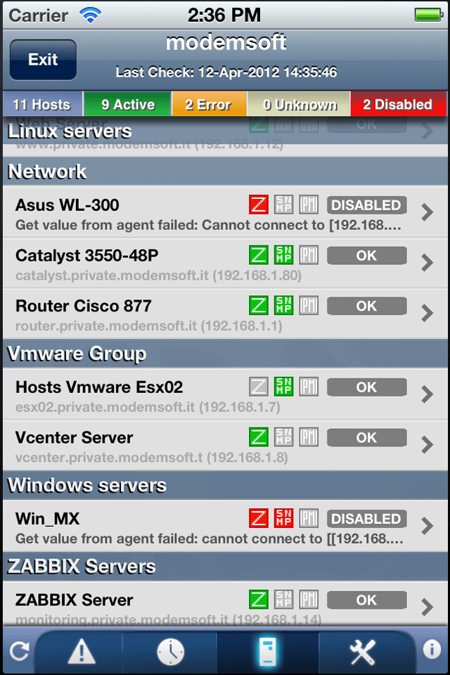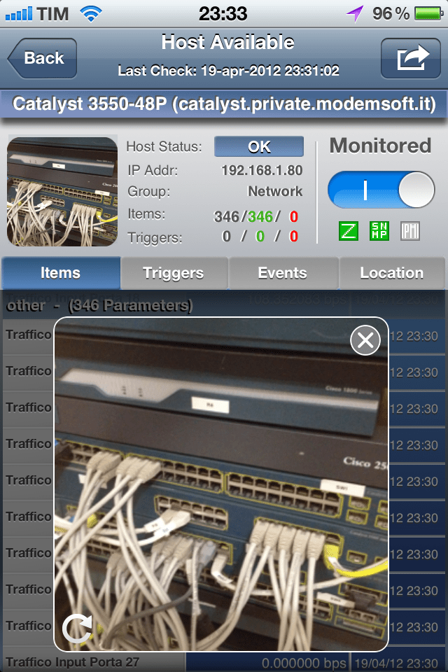 MobileOp permette di gestire le procedure di accesso, tracciamento, modifica e visualizzazione di tutte le informazioni circa lo stato dei  sistemi controllati da Zabbix direttamente sul dispositvo iOS, ricevendo in tempo reale le notifiche di stato e degli allarmi riscontrati dalla piattaforma.