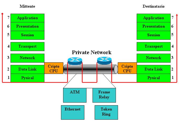La sicurezza a questo livello veniva effettuata realizzando delle reti private. Questa protezione di livello due ha offerto una protezione indipendente dal protocollo usato su specifici collegamenti non sicuri. Questo significa che protegge il traffico anche di protocolli diverso dall’IP. Ma per garantire una maggiore riservatezza veniva applicata una protezione crittografica ai due terminali del collegamento. In pratica su un collegamento tra due host tutto il traffico ha bisogno di essere cifrato per il timore che venga intercettato. In questo caso è possibile usare delle apparecchiature hardware per la cifratura. Soluzione questa molto usata in ambiente militare.